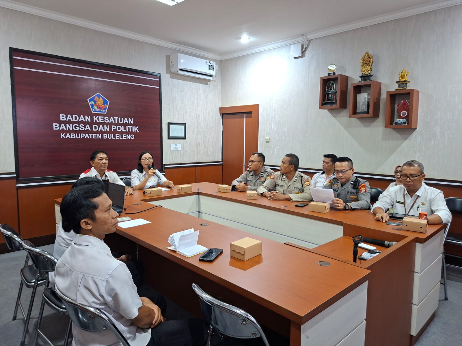 Rapat koordinasi dipimpin oleh Kepala Bidang Pengembangan Nilai-Nilai Kebangsaan, Dra. Ketut Suseni Indrawati, dan dihadiri oleh perwakilan Polres Buleleng, SPN Polda Bali, serta sejumlah Organisasi Perangkat Daerah terkait di lingkungan Pemerintah Kabupaten Buleleng.